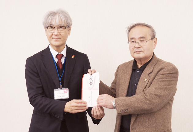 寄付金を受け取った加藤事務局長㊧と大野副会長(カリオンビルで)