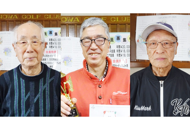 左から準優勝の初川雅之さん優勝した田中秀明さん3位の白井保弘さん=三の輪ゴルフ提供
