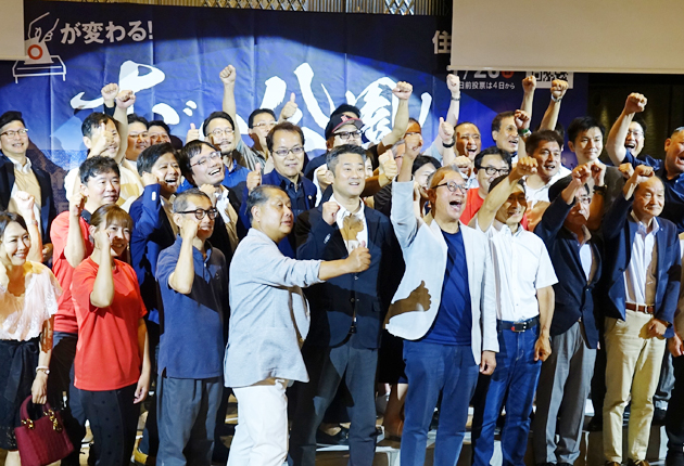 住民投票でアリーナ継続に賛成多数が確実となり、喜ぶ事業推進派の人たち(7月、市内で)