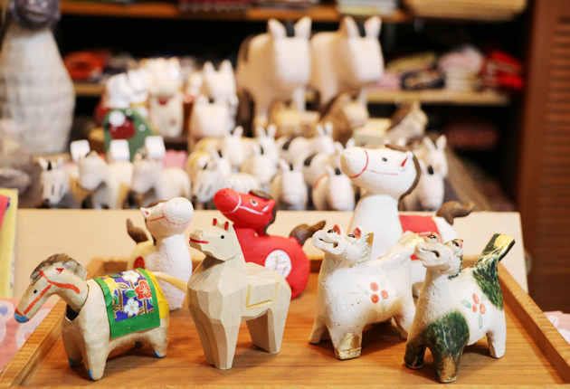 さまざまな姿の「午」の干支人形が並ぶ(こまもの屋ふじやで)