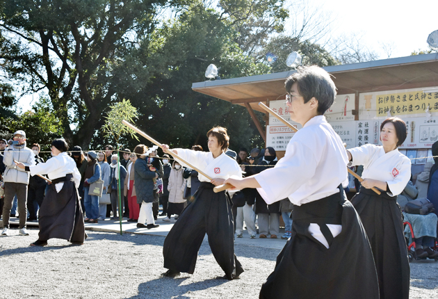 黄柳川流杖道を奉納する女性の門下生ら(砥鹿神社で)
