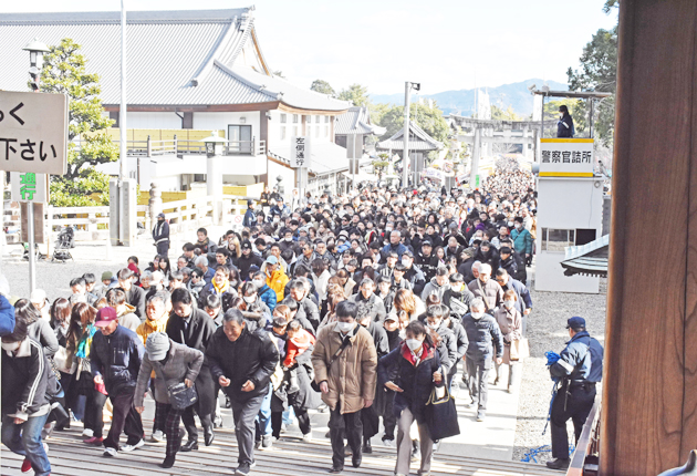 日本三大稲荷の一つ、商売繁盛や家内安全、福徳円満などのご利益がある豊川市豊川町の豊川稲荷(豊川閣妙厳寺)には、三が日で約145万人が訪れた。元日と2日は約50万人、3日は約45万人で、3日間で昨年より約10万人少なかった。好天の2日は本殿に続く参拝者の列は総門前の表参道まで連なり、本殿周辺では豊川署員らが安全を呼びかけながら誘導した。
