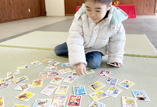 かるたを楽しむ男の子(東三河ふるさと公園で)