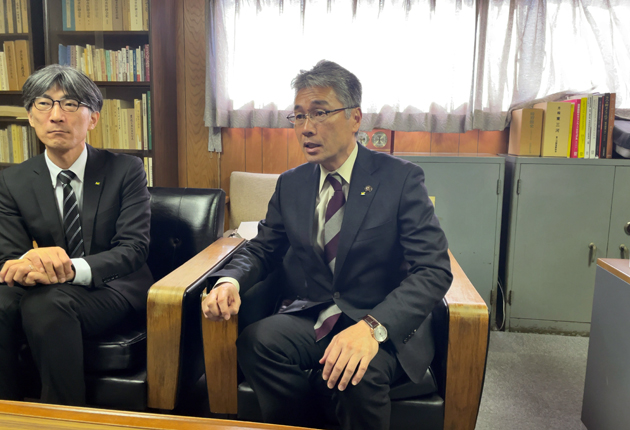 抱負を述べる下江市長㊨(東海日日新聞社で)