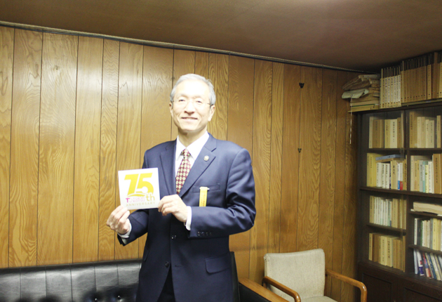 75周年のロゴを持つ青木社長(東海日日新聞社で)