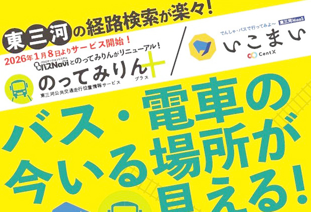 また、「いこまい」との連携で行き方や乗り継ぎ検索が容易になるほか、モデルコースや観光情報の検索も可能で、地域の最新情報がわかるなど、利便性の向上が見込まれている。1月8日からはweb版の利用が可能。アプリ版の利用開始日は未定で、確定次第豊橋鉄道ホームページに掲載される。詳しくは豊橋鉄道総合企画部=0532(53)2134=へ。
