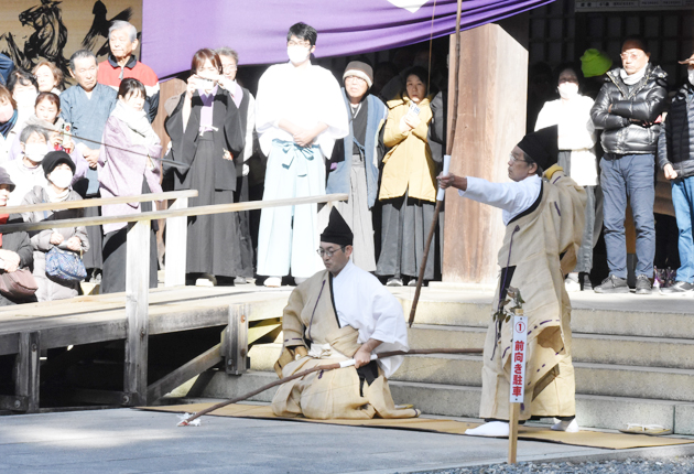 豊川市一宮町の三河国一之宮・砥鹿神社(岩崎和夫宮司)で8日、年頭の祭典・弓始祭(ゆみはじめさい)が営まれた。