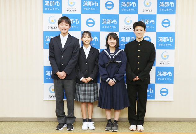 新制服を試着した生徒(左の2人)と、現行の制服の生徒たち=蒲郡市役所で(提供)