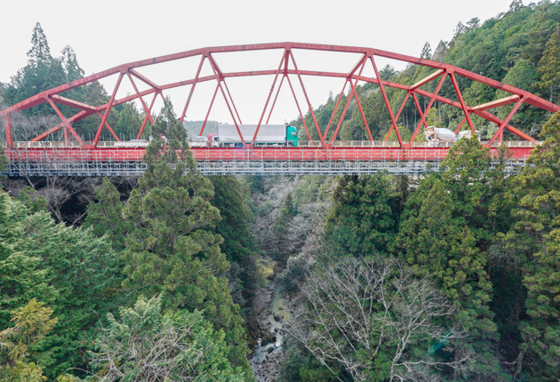 朱色に塗られたアーチが緑に映える設楽大橋は、設楽町の山あいにある長さ約100メートルの鉄橋で、町民から長らく「赤い橋」と呼ばれてきた。間もなく白く塗り替えられるが、これまでのシンボルカラーは、設楽ダム建設を控えて新しく架けられた巨大コンクリート橋に引き継がれた。