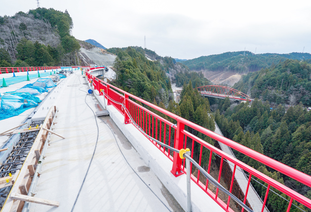 現道より30㍍ほど高い海抜460メートルほどの位置に架けられ、長さは357㍍。歩道の手すりなどとして使われる高欄に「赤い橋」の朱色が採用された。