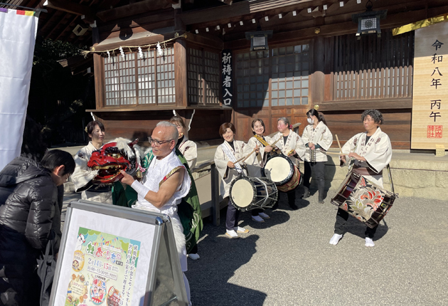 獅子舞踊りを披露する新城えびす太鼓(砥鹿神社で)