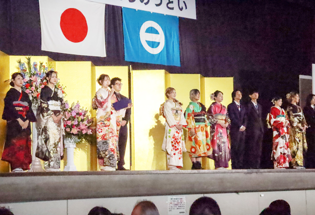 蒲郡市では11日、二十歳を祝う「はたちのつどい」が市民体育センターで開かれた。振り袖や羽織はかま、スーツに身を包んだ若者たちが友人や恩師らとの再会を喜び合った。