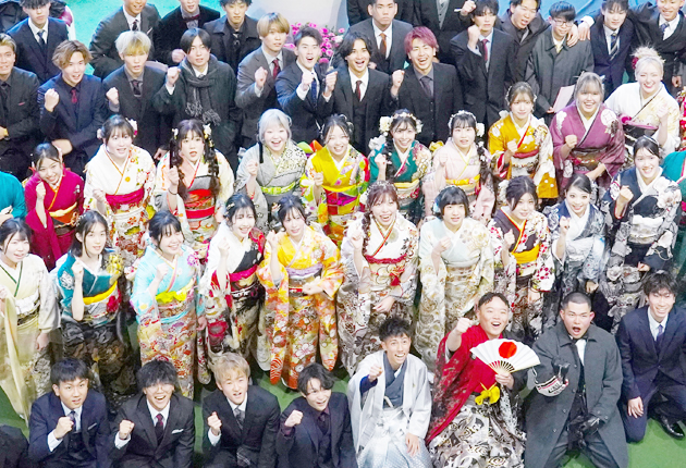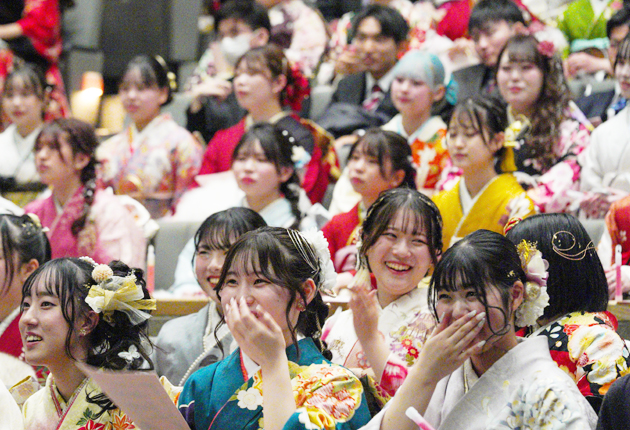 新城文化会館で開かれた新城市成人式には、晴れ着やスーツで身を包んだ359人が集い、互いの成長を確かめ合った。中学校の教師らが寄せたビデオメッセージが流れると、会場のあちこちから歓声が上がった。
