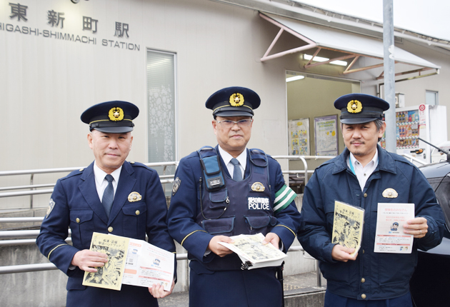 チラシを手にする署員ら(新城市のJR飯田線東新町駅で)