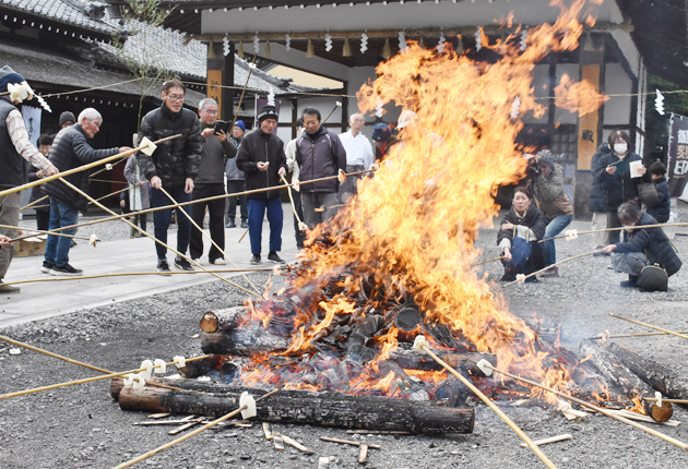 昨年1年間のうちに神前に納められた祈願絵馬や願い串、安産を願う柄杓(ひしゃく)守りなどをスギの葉と一緒に燃やし、諸願成就を祈願。この炎で焼いた鏡餅を食べると無病息災のご利益があるとされ、参拝者らが切り分けられた餅を竹の棒の先に刺して火にあぶり、柔らかくなると味わった。