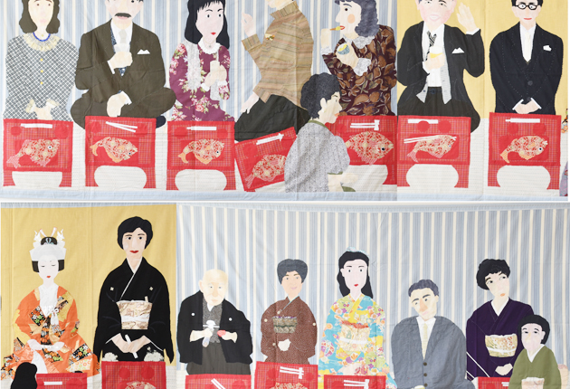 作品は、縦1・5メートル、横7・5の横長の大作「大安吉日」で、伝統的な結婚式の祝いの様子を新郎・新婦、参列者それぞれの服装、仕草、表情の違いで表現している。
