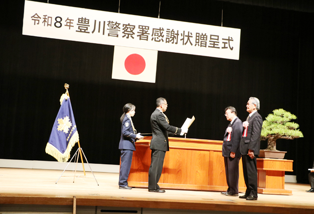 豊川署は16日、警察業務の各般にわたり、多大な協力をした団体と個人を表彰する「感謝状贈呈式」を豊川市文化会館で開いた。