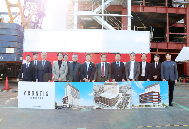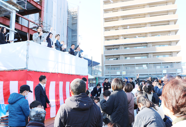 豊川市の玄関口であるJR豊川駅東側に建設が進められている「(仮称)豊川駅前複合ビル」の建物名称発表と上棟セレモニーが17日、建設地で開かれた。地元出資企業や出店企業とともに、地元住民など約270人が集まる中で行われた。
