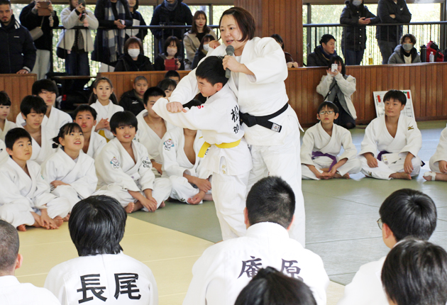 柔道女子63キロ級でアテネ五輪、北京五輪を2連覇した桜丘高校出身の谷本さんは、実技指導を交えながらゆで卵に例えて姿勢の重要性を説き「投げ技は回転が重要。柔道を通じて心と体を鍛え、夢に向かって挑戦してほしい」と話した。