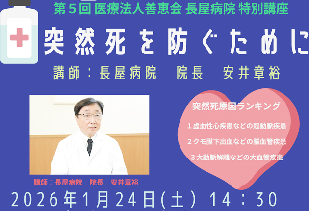 長屋病院(豊橋市八町通)は24日午後2時30分から、同院1階待合スペースで地域住民や患者、家族を対象にした特別講座「みんなが知りたい予防医療」を開く。第5回となる今回は安井章裕院長が「突然死を防ぐために」をテーマに講演する。 同院によると...