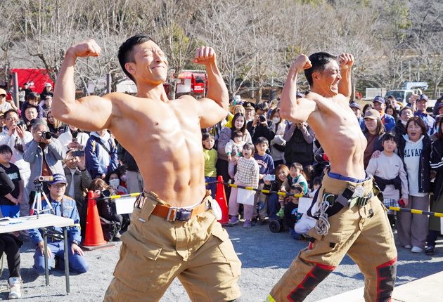 新城市の桜淵公園で18日、消火・救急の訓練、はしご車搭乗といった催しを楽しめる「新城消防祭」が開かれた。飲食の出店も並ぶ中、子供連れなど大勢の人が来場。消防士らがムキムキに鍛えた筋肉を披露するボディービル大会も、初めて行われた。