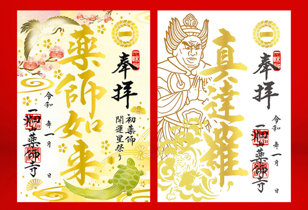 一畑山薬師寺(岡崎市)は、月替わりの限定ご朱印を5年ぶりに刷新した。今月は「薬師如来」と「真達羅(まだら)」大将の2種類で、中央に金色で箔(はく)押しされている。今月末までの期間限定で各500円。