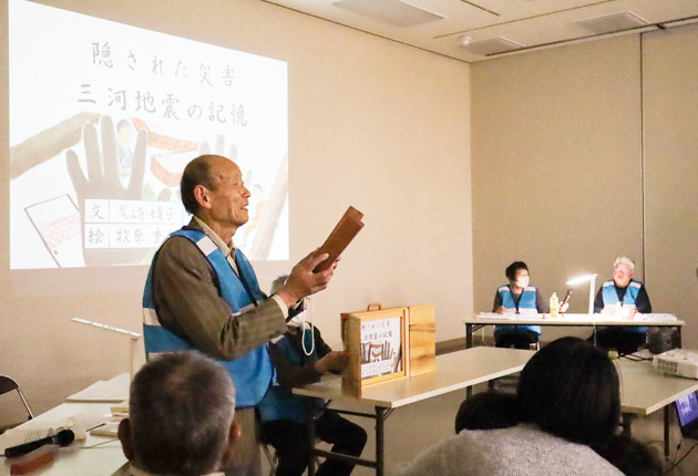 紙芝居は「隠された災害 三河地震の記憶」と題し、被災者からの聞き取りや文献を基に作られた。倒壊した家屋の下敷きになって亡くなった人や奇跡的に生き延びた人、避難生活の苦労などが描写されている。来場者は、巳午会の尾崎嬉子さん(84)と田中伸子さん(83)による方言を交えた素朴な語り口に聞き入っていた。