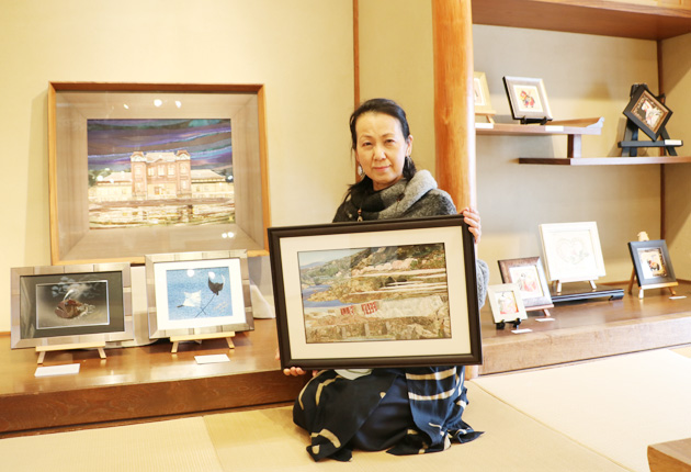 正絹の着物地を使って創作絵画を描く名古屋市の作家、前野節さんが、25日まで豊川市大橋町のギャラリー花棕櫚で作品展「絹彩画(きぬさいが)展」を開いている。 絹彩画は、木目込み人形の技法を踏襲した前野節さんオリジナル技法で描いた平面作品。干支...