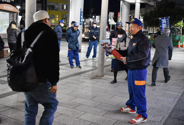 通行人に啓発品を配る消防団員㊨(豊川駅前で)