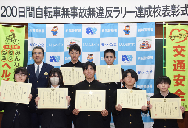 新城市の公立中学・高校8校すべてが参加した「200日間自転車無事故無違反ラリー」(新城署主催)の表彰式が23日、同署で行われ、目標を達成した全学校の代表生徒に賞状と記念品が渡された。