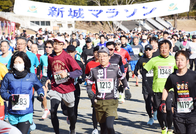 新春の奥三河を駆け抜ける第47回新城マラソン大会が25日、新城市の県営総合公園陸上競技場を発着点に開催された。健康ジョギング3キロと高校生・一般男女10キロ・5キロの年齢別24部門に、市内を中心に県内外から975人がエントリーした。