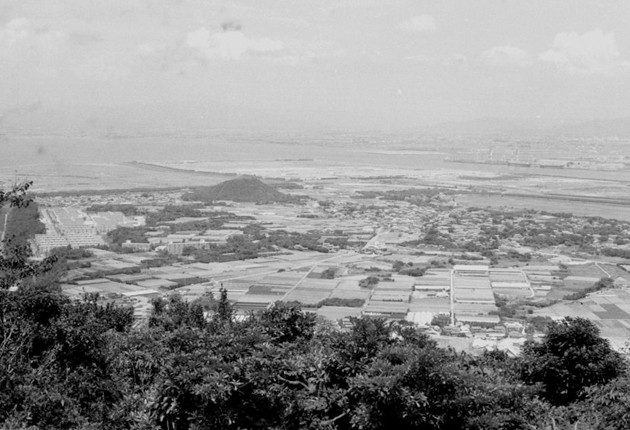 上の写真は、1979(昭和54)年に蔵王山(標高250メートル)山頂から北東の童浦地区を撮影したものである。中央左に見える小山は標高79メートルの笠山。その先には三河湾、右手には汐川干潟が広がっていた。