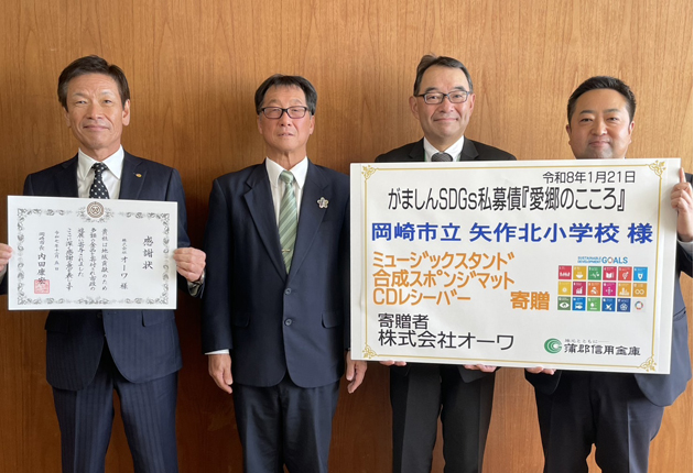 旅客自動車運送業などの「オーワ」(岡崎市)はこのほど、同市立矢作北小学校にCDレシーバーとミュージックスタンド、合成スポンジマット(計16万円相当)を贈った。
