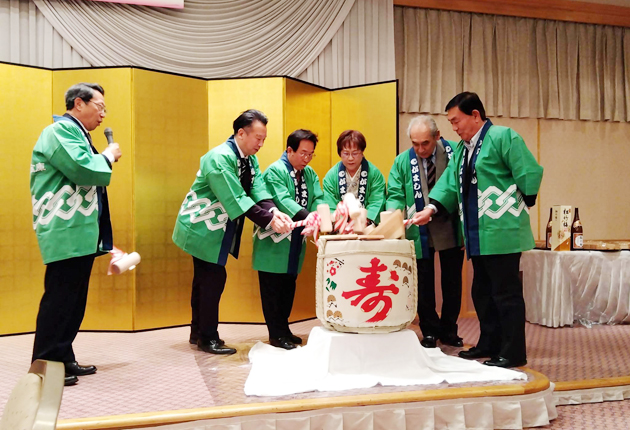 鏡開きで新春を祝う出席者(田原市の崋山会館で)=提供