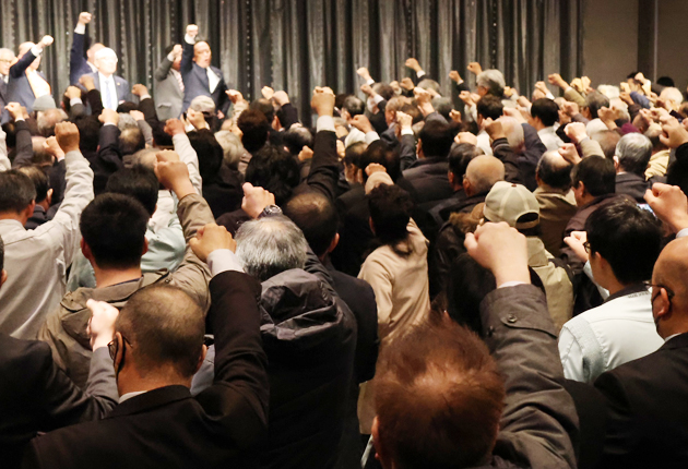衆院選が公示され、「頑張ろう」とこぶしを振り上げる支持者ら(豊橋市内で、石川正司撮影)
