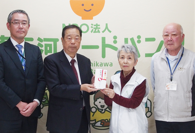 彦坂会長(中央)、佐口支店長(左端)と柏熊理事長、服部事務長(右端)=東三河フードバンクで