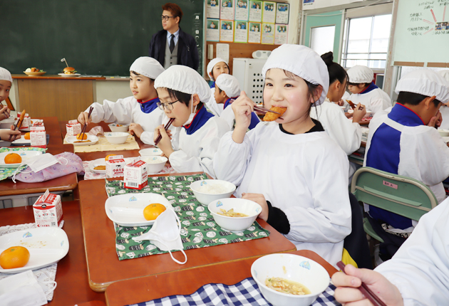 蒲郡市立三谷小学校では27日、親子煮、白米、ミカンという献立に、イカフライのレモン煮が加わった。子どもたちは「いただきます」と声を合わせると、真っ先にイカフライにかじりついた。根岸仁椛さん(11)は「イカがやわらかくてフライの食感もいい。味付けが蒲郡と似ていて、ご飯が進む」と気に入っていた。