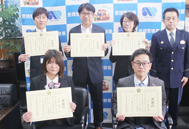 詐欺被害を防いだとして、豊橋署は28日、豊橋市内の金融機関2支店と職員、コンビニエンスストアに感謝状を贈った。清永芳弘署長が「皆さまは最後のとりで。全国で被害が多発しており、引き続き協力お願いしたい」と功労をたたえた。