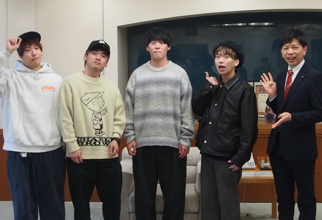 4月4日に豊橋総合スポーツ公園(豊橋市神野新田町)で初の野外フリーライブを行うロックバンド「04 Limited Sazabys(フォーリミテッドサザビーズ)」のメンバー4人が28日夕、同市役所を訪れ、長坂尚登市長を表敬訪問した。