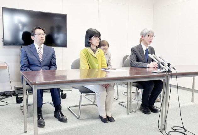 記者会見した共産党の関係者ら(豊橋市役所で)