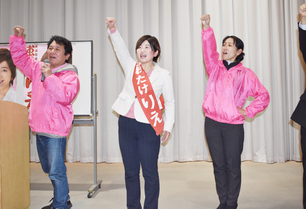支援者らと「ガンバロー」と意気込む大嶽氏㊥(蒲郡商議所で)