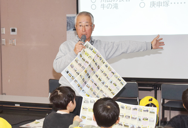 会が以前作成した千里物語マップを使ったクイズもあり、児童らは元気に回答していた。
