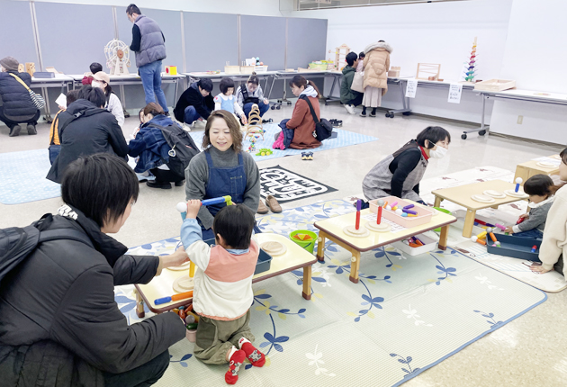 会員30人が手遊びやダンス、絵本の読み聞かせのほか、玉入れや風船、紙飛行機やお手玉といった遊びの場を提供。おもちゃコンサルタントマスターの資格を持つ会員が用意した木のおもちゃや、折り紙で作った魚釣りやペットボトルで作った的当てなど、創意工夫が凝られたブースも好評だった。