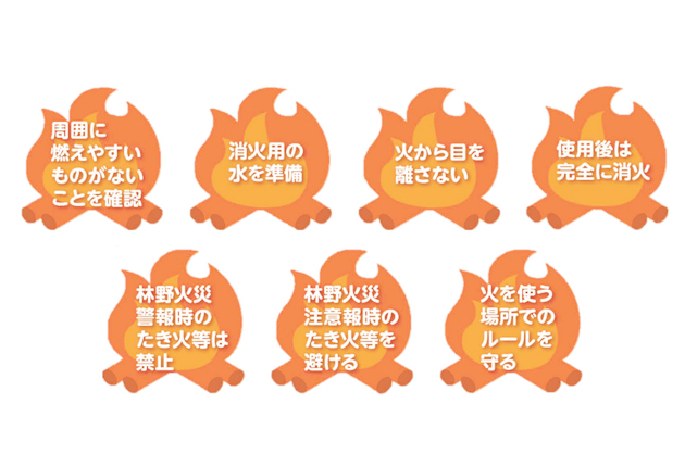 乾燥していたり強風が吹いていたりする時は、林野火災の発生や延焼拡大の危険が高いとして、屋外での火の使用はしないことや、火を扱う場合は周囲に燃えやすいものがないか確認して消火用水を準備し、目を離さないように求めた。
