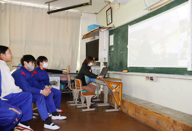 オンラインで広安小と交流する三谷小の児童ら(蒲郡市立三谷小学校で)