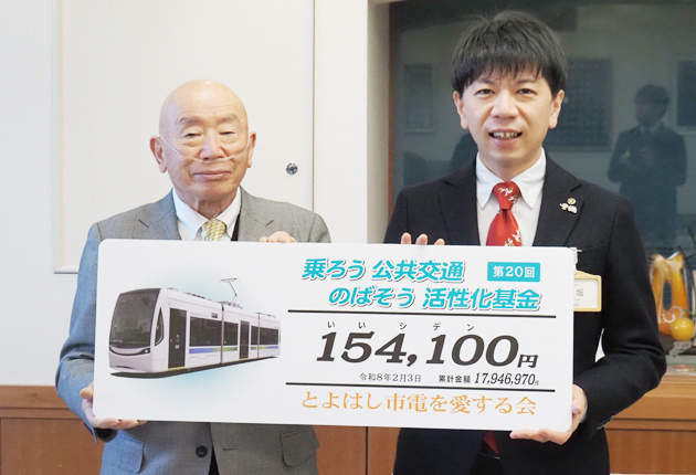 「とよはし市電を愛する会」(髙須博久会長)は3日、豊橋市地域公共交通活性化基金に15万4100円を寄付した。「いいしでんを」の言葉の語呂合わせで金額を決めたという。 この日、市役所であった贈呈式で、髙須会長が長坂尚登市長に目録を手渡した。...