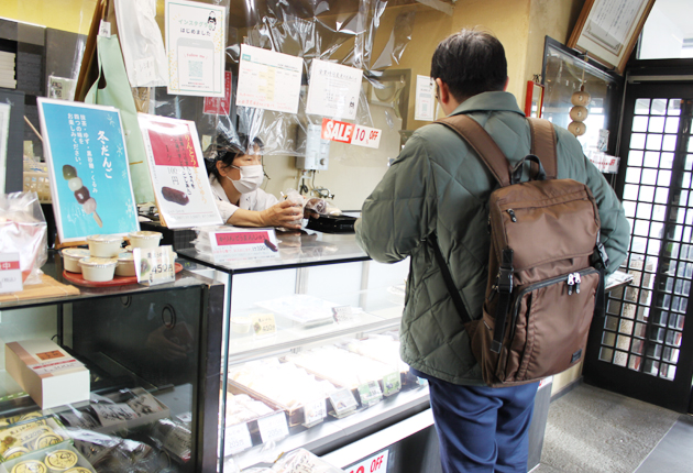 今の季節のお薦めは、いちごころもや若草もち。名物のみたらしだんごも外せない。朝作る生菓子が多く、売り切れ次第終了となる。5日の店頭には大勢の客が詰め掛け、順番を待っていた。