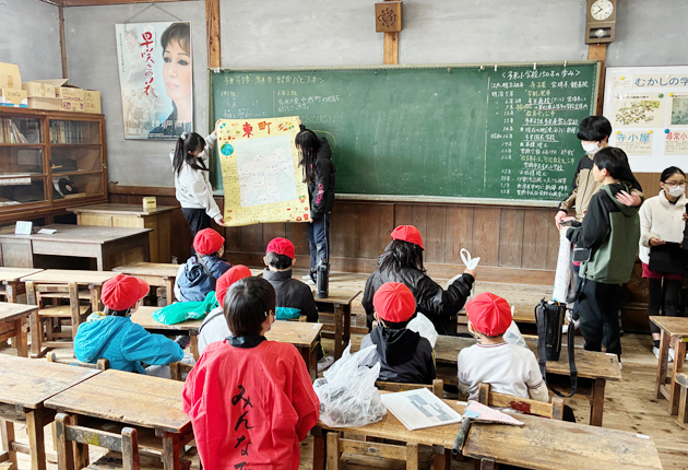 多米校区を紹介する児童たち(豊橋市民俗資料収蔵室で)