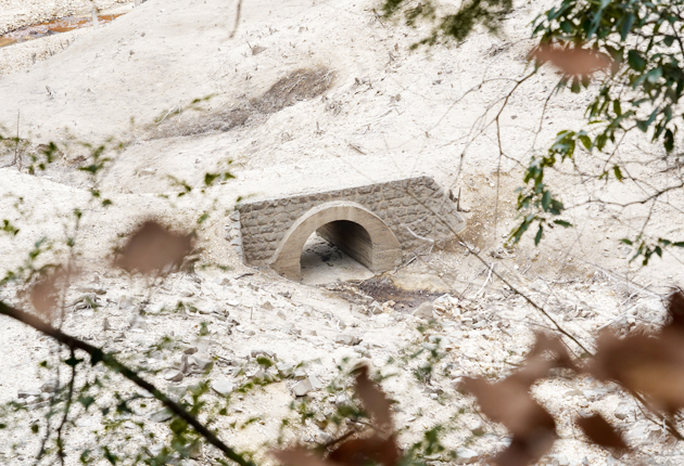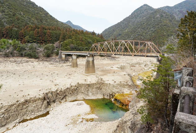 現在の水位は満水時より41メートル低く、貯水率は平年の1割弱。上流部では、普段は水面下に隠れている橋や滝が姿を現していた。