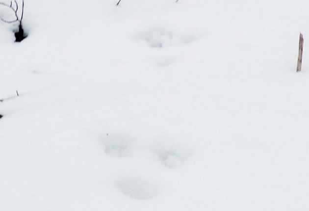 ウサギの足跡。進行方向は手前から奥だが、二つ並んだ穴が後ろ足で、前足は合わさって一つに見える=同
